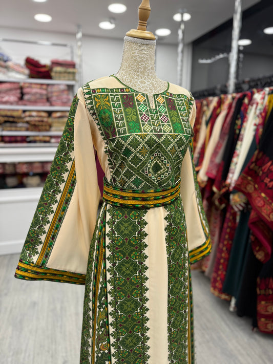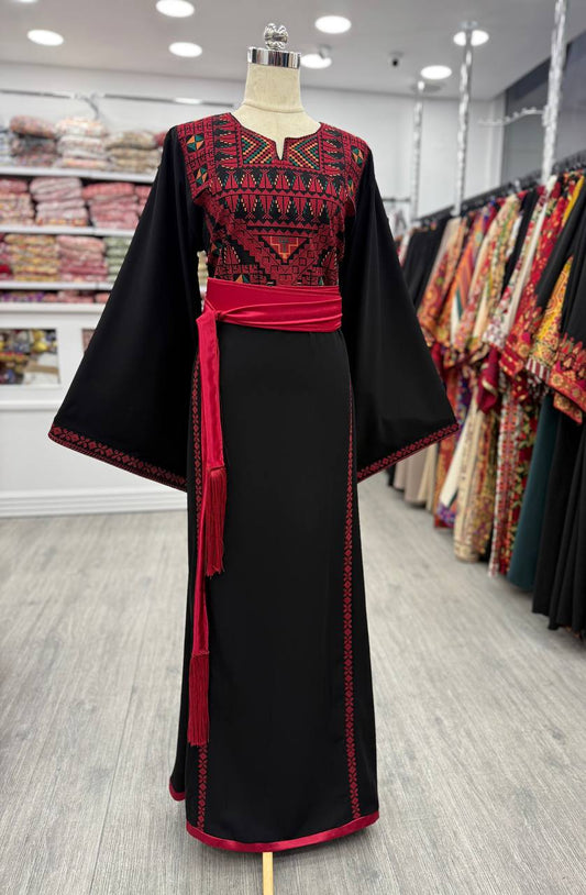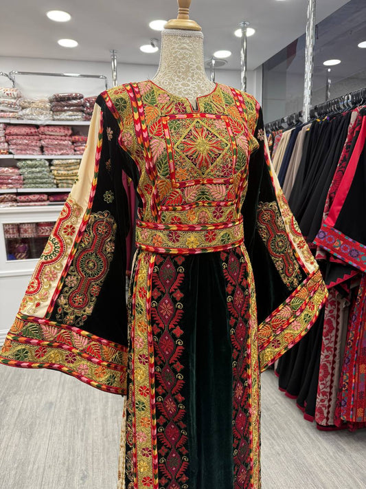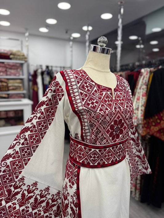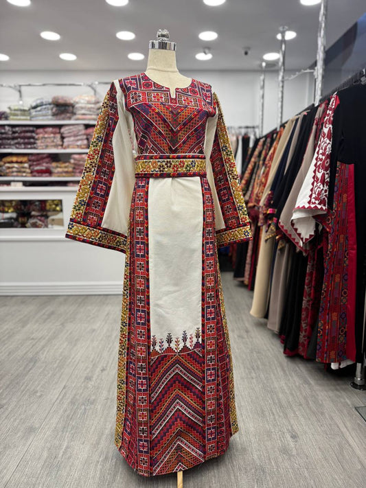 فساتين فلسطينية تقليدية ملفوفة بالتطريز المعقد، أو التترييز، لإعطاء كل فستان نمطًا فريدًا