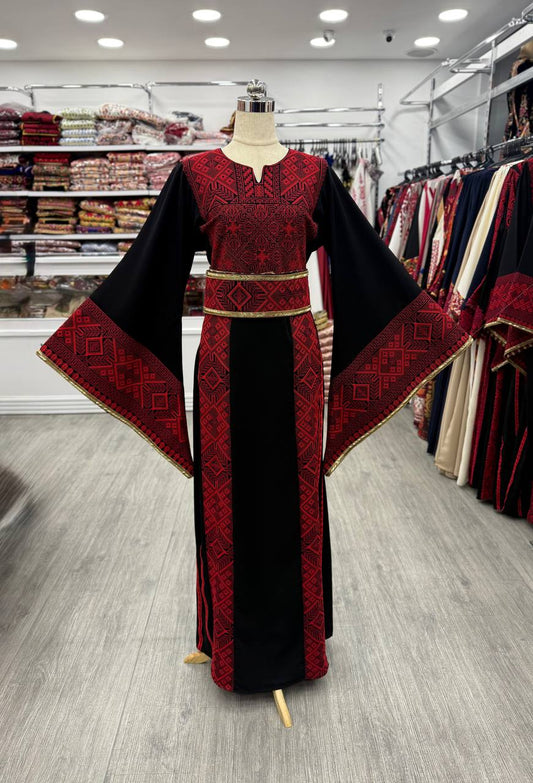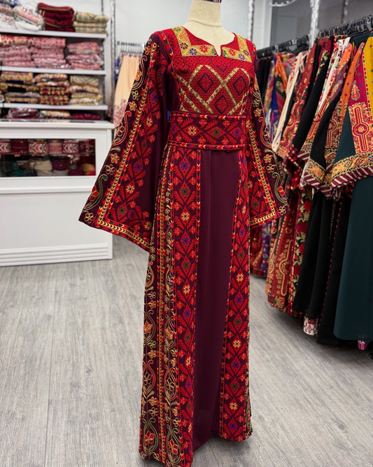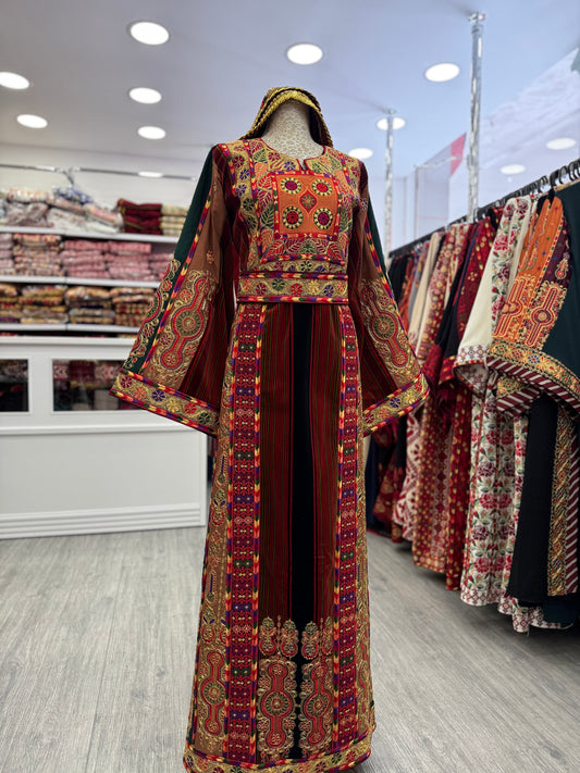 فساتين فلسطينية تقليدية ملفوفة بالتطريز المعقد، أو التترييز، لإعطاء كل فستان نمطًا فريدًا